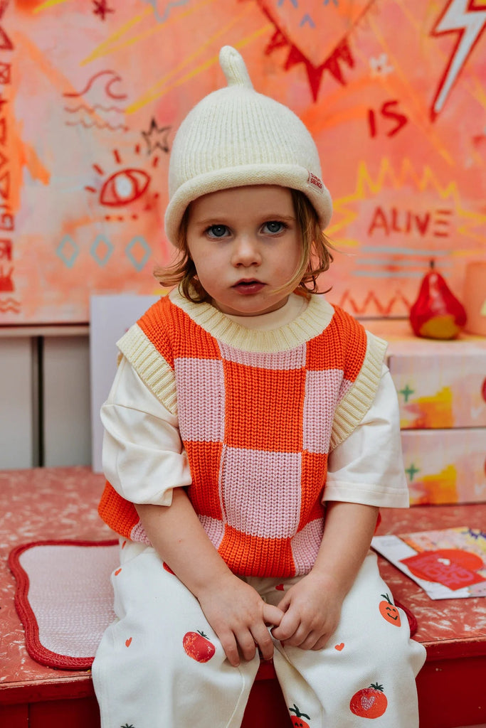 Our signature checkered knit, in an adorable round neck vest. Pink and orange check pattern with cream trim. Comfortable, relaxed fit, real grandad vibes. Made from 100% cotton.