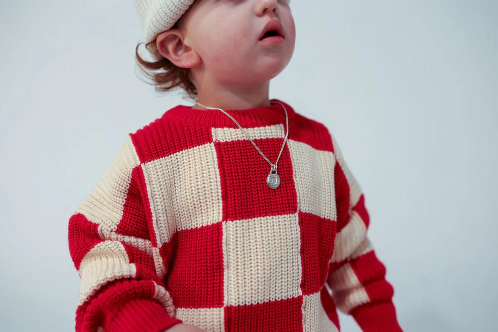 Our signature checkered knit jumper in red and cream. Your babe will be snug as a bug in this jumper. Comfortable, relaxed fit and made from 100% cotton.