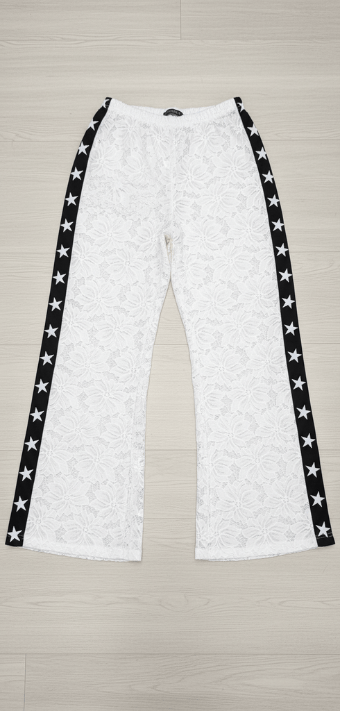 *Star-Struck Lace Palazzo Pants** Elevate your summer style with our chic and breezy Star-Struck Lace Palazzo Pants! Crafted from delicate white floral lace, these wide-leg pants offer a sophisticated yet playful vibe. The elastic waistband ensures a comfortable fit, while the sheer lace design provides a beautiful, airy feel perfect for beach days, resort wear, or a stylish night out.