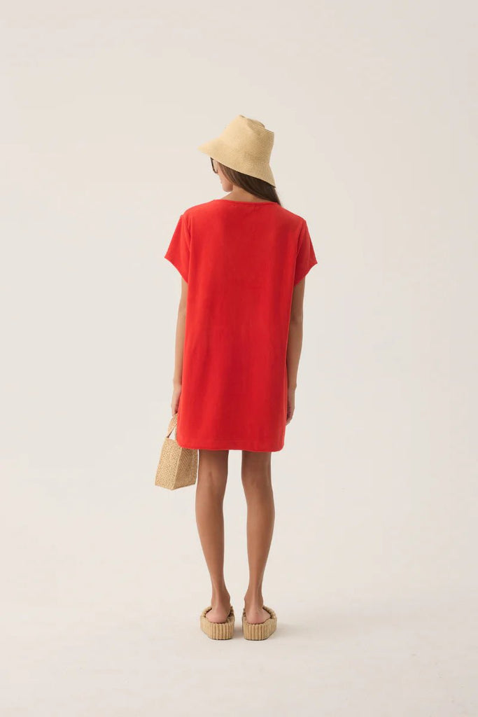 Step into Summer in the Tropiques Terry Dress in Apple Red. Crafted from 100% premium cotton terry towelling, this relaxed mini dress is effortlessly wearable and irresistibly soft. Designed with retro contrast stripes across the front, and tie belt, it’s made to stand out. A curved hemline, side splits and deep v-neckline ensures a flattering fit. Pair with your favourite sneakers or slides, and layer over swim for your next seaside escape.