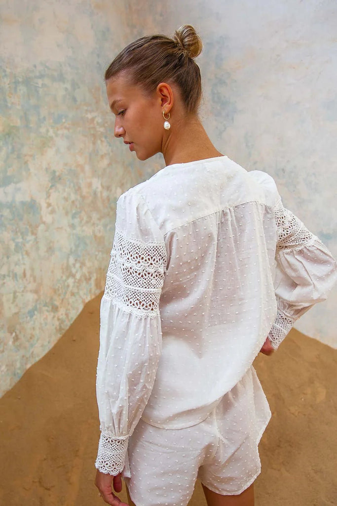 The Lotus cotton white high waisted shorts are made from 100% Cotton Swiss Dot fabric and feature an elastic waistband and draw cord for ultimate comfort and an easy fit. A mid-waisted style and fully lined for non-transparency. Style it with our matching 'Isabella' blouse to create the perfect duo. Exclusively by Palm Collective. Features: