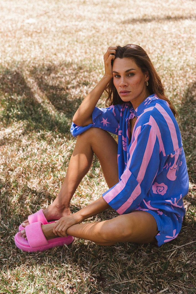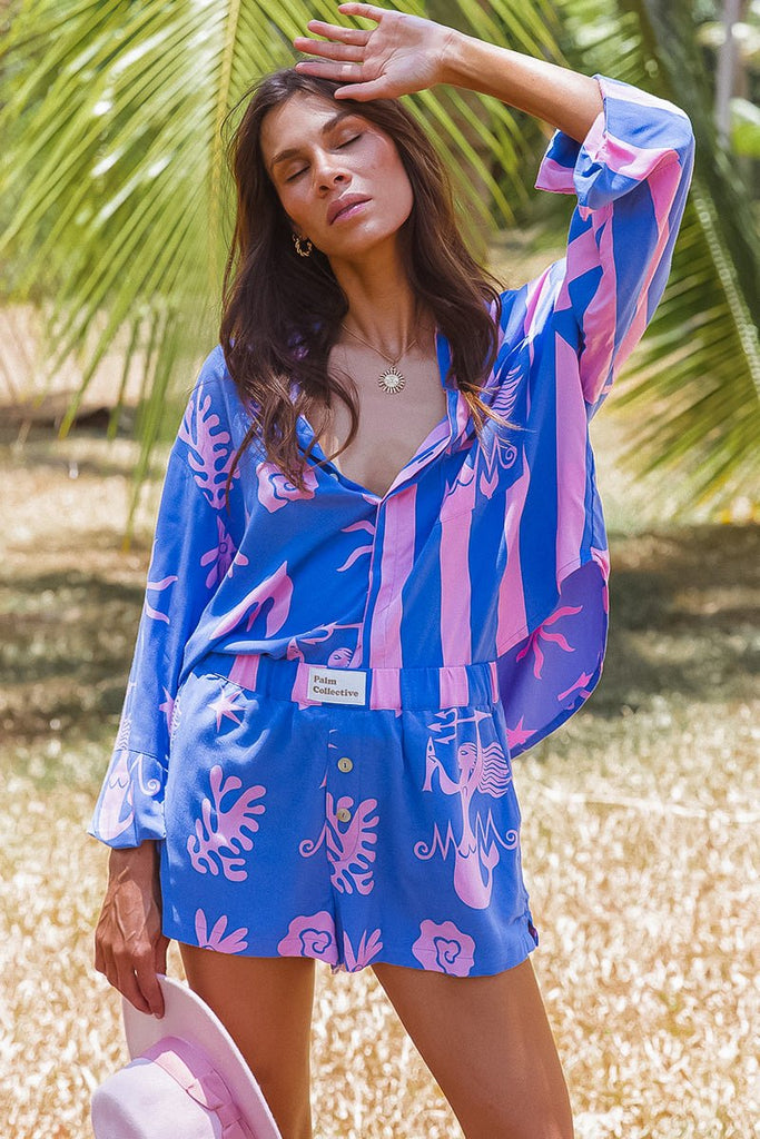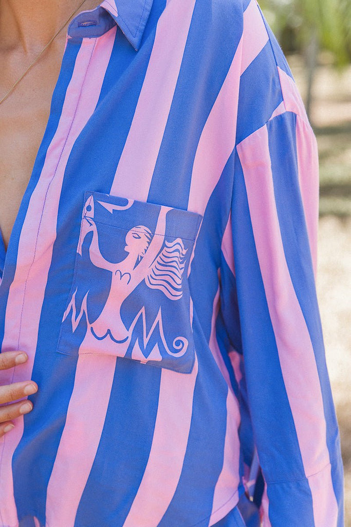 Our new 'Nemo' blouse features our exclusive 'Mermaid Sea' print in a blue and lilac, and a striped contrast panel. Made from 100% rayon, this blouse features a relaxed fit, hidden shell buttons down the centre front, wrist cuffs, a collar and front patch pocket. Pair it with our matching 'Just Keep Swimming' shorts to create the cutest two piece set for the summer season.
