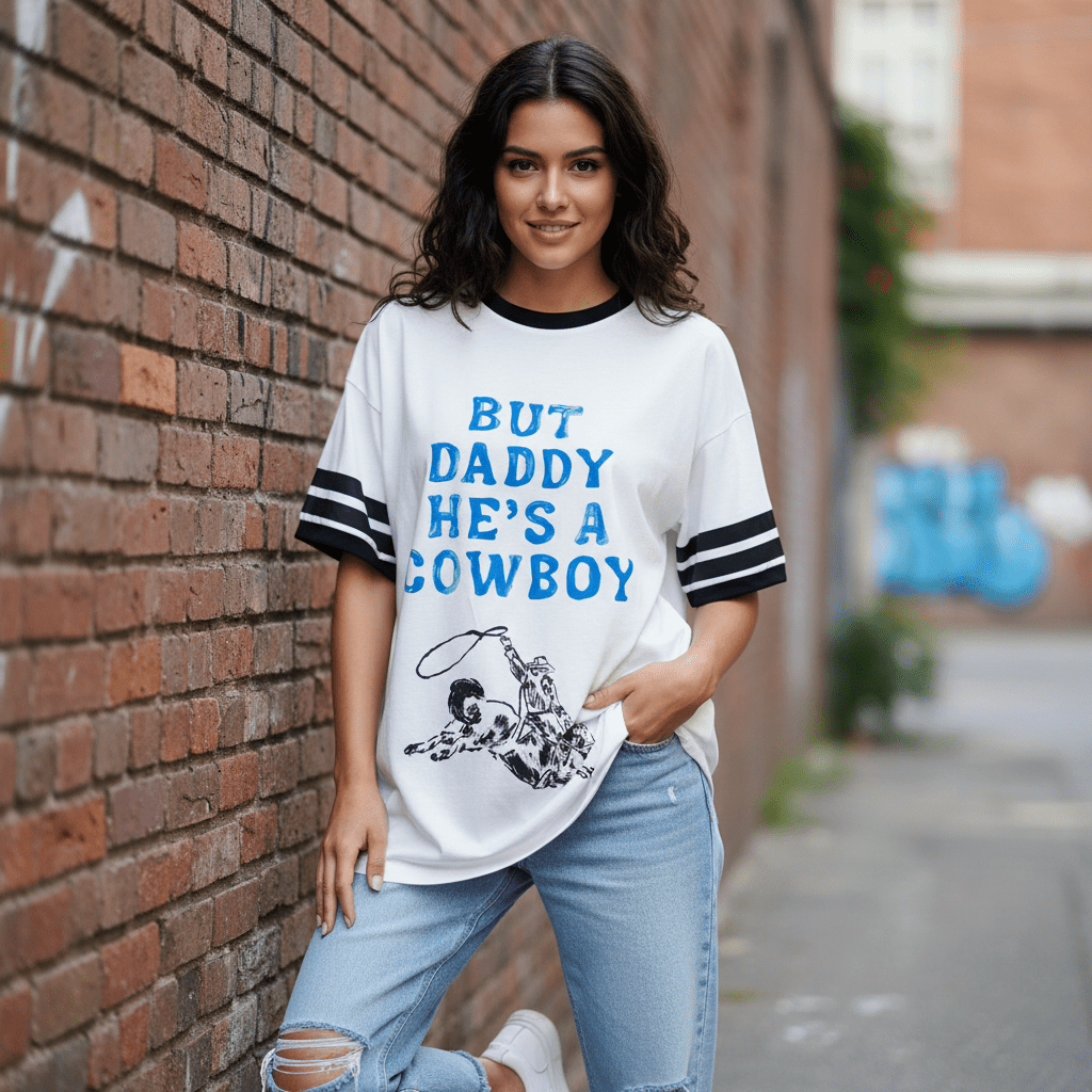 Embrace your wild west spirit with our playful "But Daddy, He's a Cowboy" graphic tee! This charming pink t-shirt features a bold blue print and a dynamic illustration of a cowboy on a bucking bronco, lasso in hand. With its relaxed fit and classic crew neck, it's perfect for adding a touch of country charm to your everyday fits.